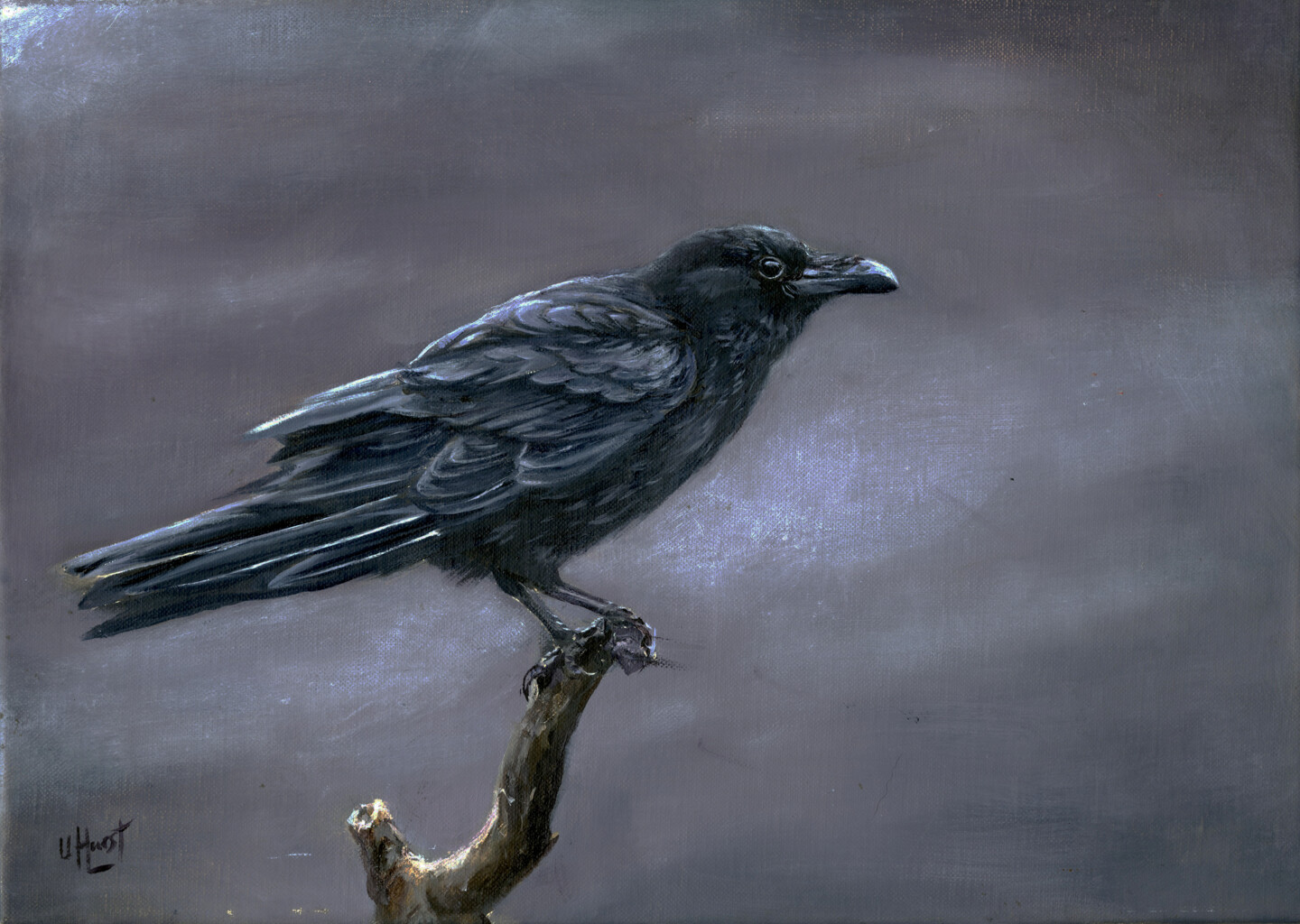 Atmospheric and moody original oil painting of a raven on a tree set against a dark sky. 45 x 35 x 3 cm (framed) / 36 x 26 x 1.8 cm (unframed) / 36 x 26 cm (actual image size).